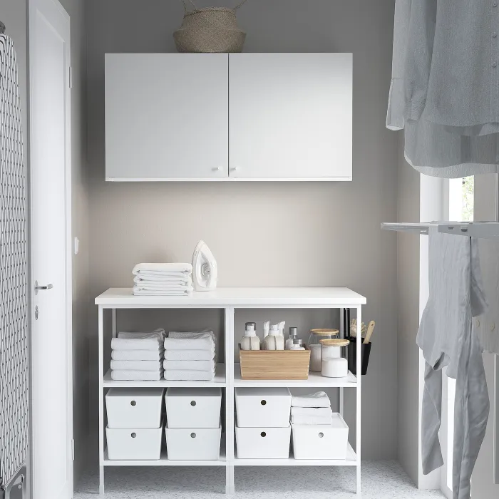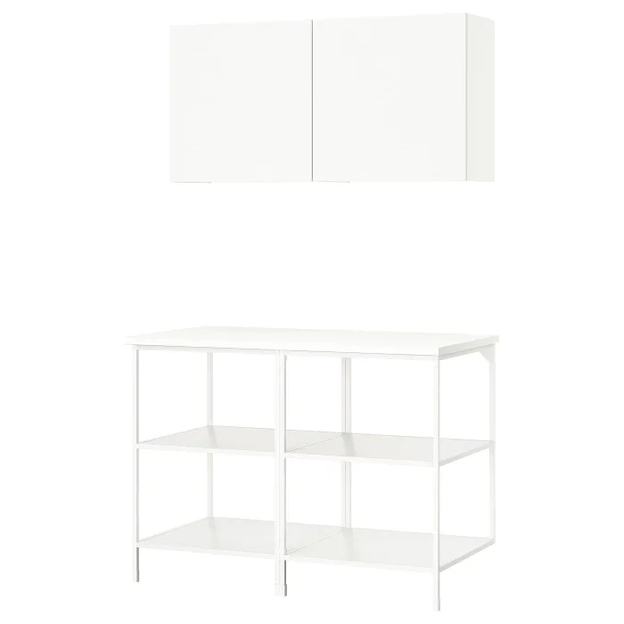 Серія ENHET підвісна, олія почати нове життя з новим кухонним рішенням. Тут є як відкриті, так і закриті місця для зберігання речей, а також велика стільниця, на якій можна розмістити як портативну плиту, так і кавоварку.
