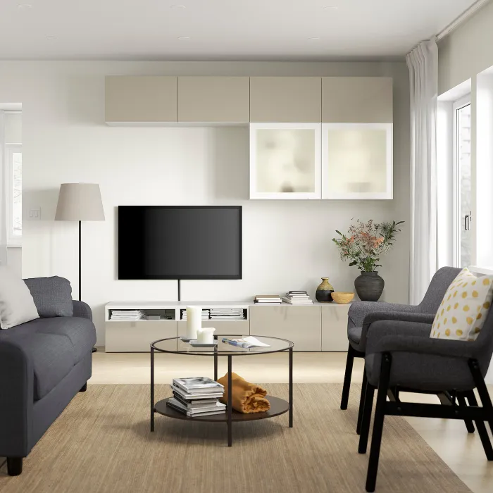 IKEA BESTÅ(594.122.21) комбінація для телевізора / скляні двері, білий / Selsviken глянцевий / бежеве скло матове