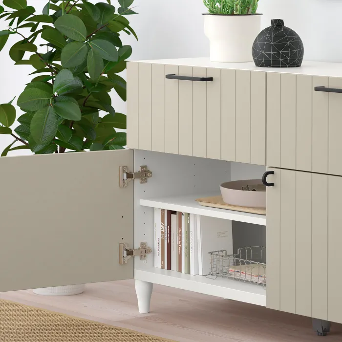IKEA BESTÅ(493.848.84) поєднання полиці з дверцятами/шухлядами, білий / Sutterviken / Kabbarp сіро-бежевий