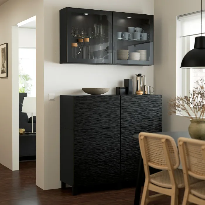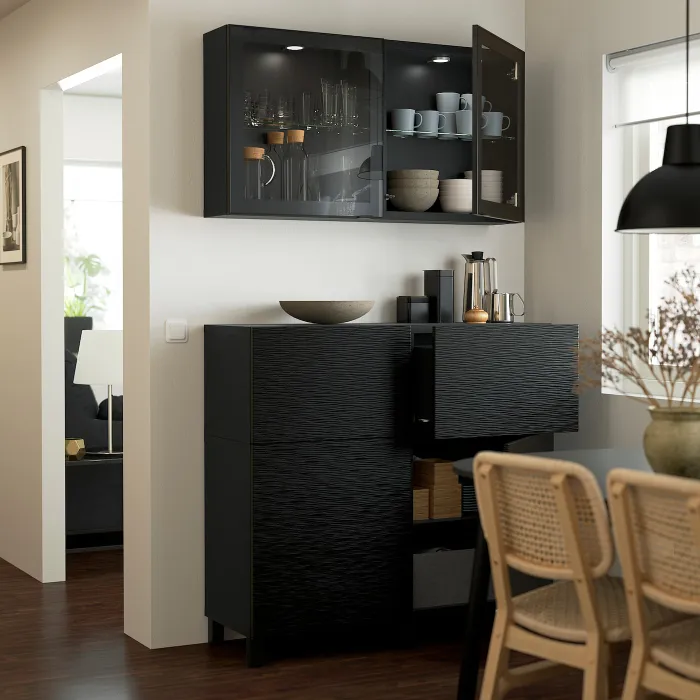 IKEA BESTÅ(194.215.57) поєднання полиці з дверцятами/шухлядами, чорно-коричневий Laxviken / чорне прозоре скло