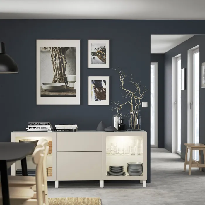Ця комбінація складається з кількох окремих одиниць. Використовуйте верхню панель BESTÅ, яка продається окремо, щоб закрити стик між рамами для безшовного вигляду.