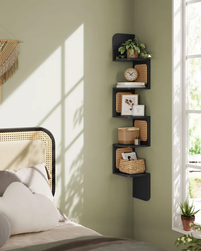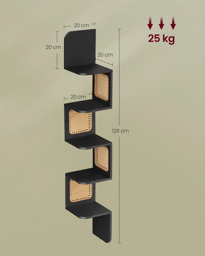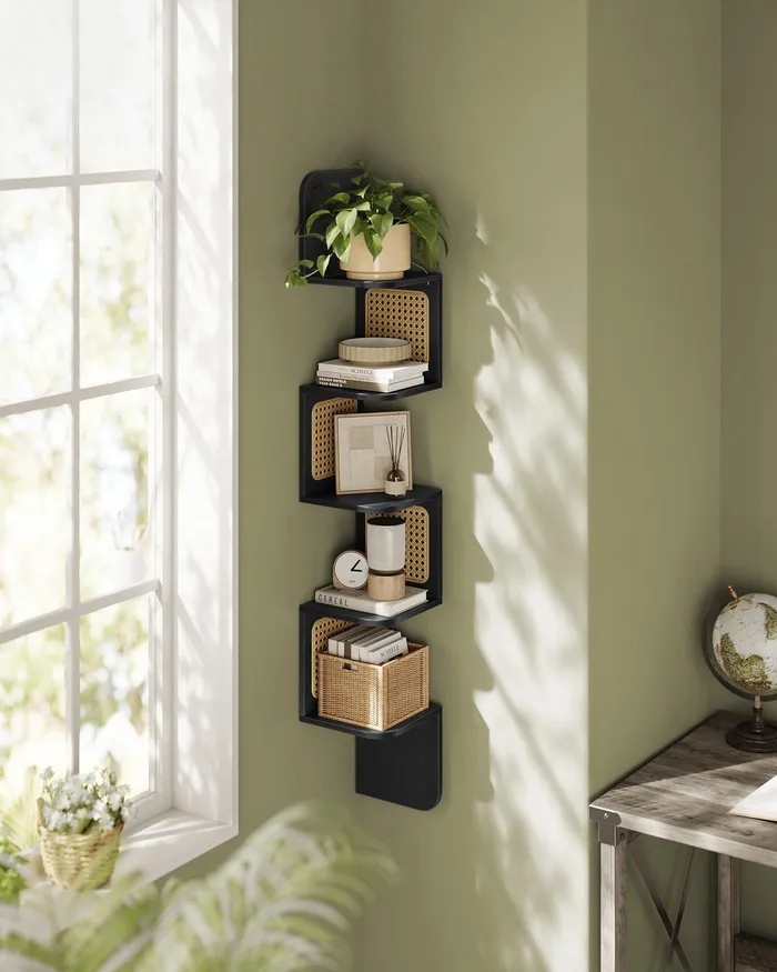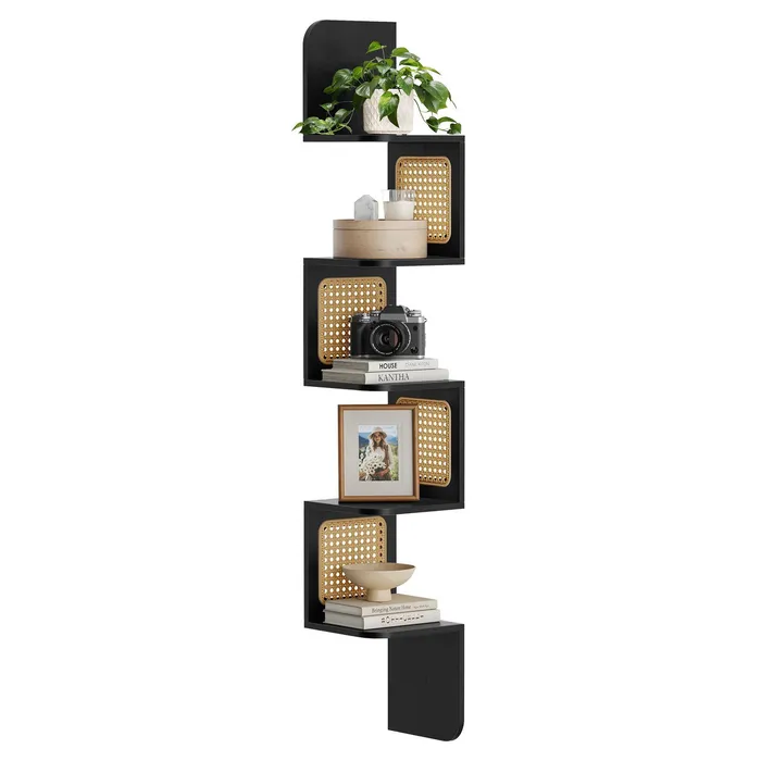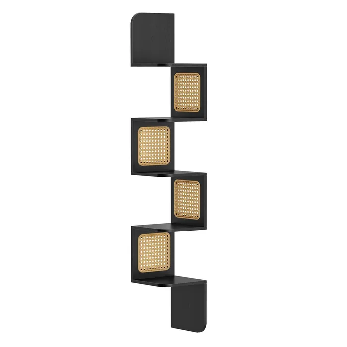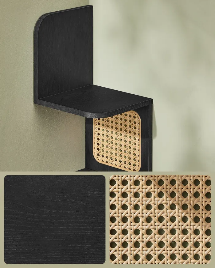 Чорна книжкова шафа з панелями ротанга
