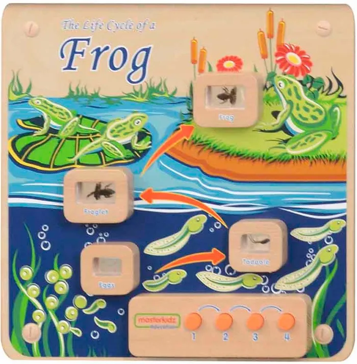 Чудова сенсорна дошка, яка у доступній для дітей формі покаже життєвий цикл жаби. Завдяки панно Мастеркідз діти можуть зацікавитись надзвичайно цікавим світом природи. Натискаючи кнопки в правильному порядку, ваша дитина виділятиме кожен етап розвитку жаби.