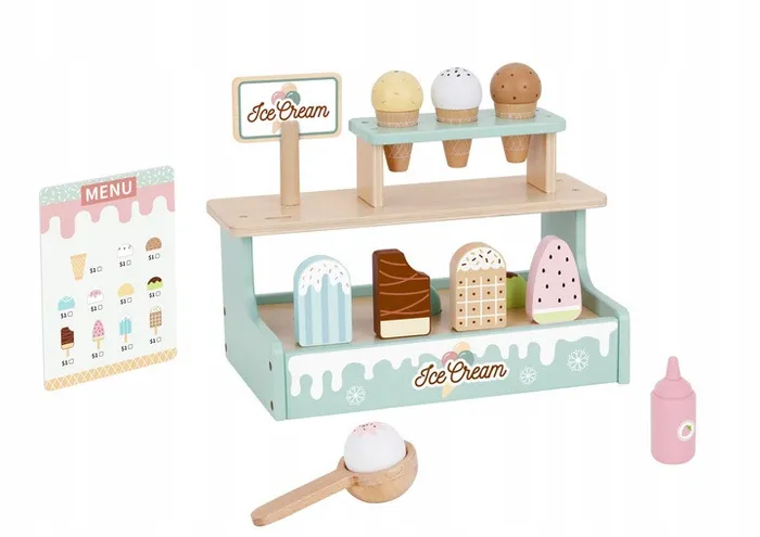 Дерев'яна підставка для морозива від бренду Tooky Toy - ідеальний варіант для діток, які люблять творчі ігри. Цей набір не тільки ідеально підходить для ігрового магазину, де діти можуть зображати з себе продавців морозива, а й є прекрасним аксесуаром для обладнання дитячої кухні. Його чудова якість виготовлення, чарівні кольори та практичність гарантують, що діти насолоджуватимуться багатьма годинами творчої гри. До набору входить дерев'яна підставка для морозива в красивих пастельних тонах, морозиво на паличці, вафлі та ложки для морозива, з'єднані магнітом, ложка для морозива та меню.