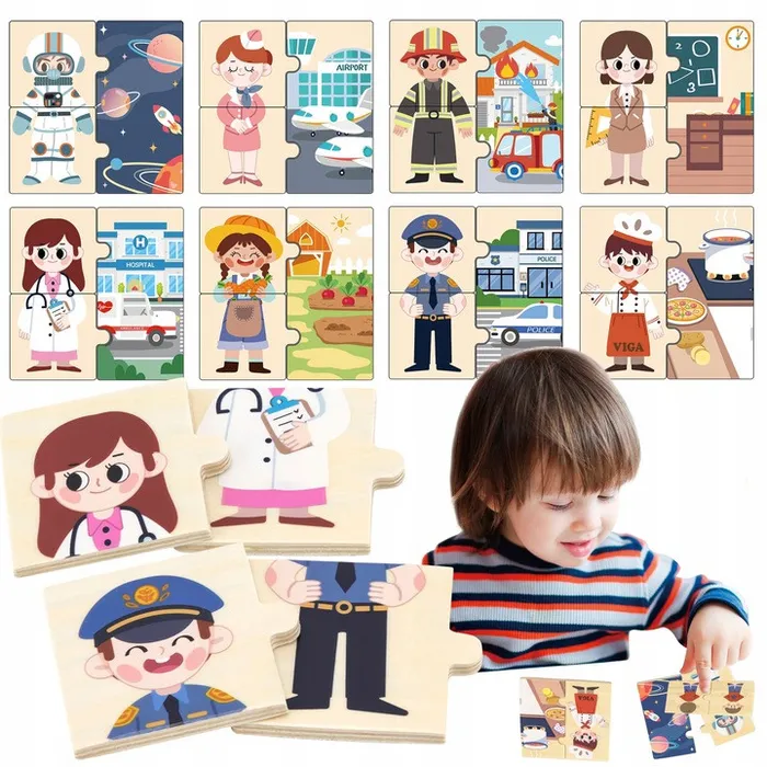 Дерев'яний пазл VIGA дозволить вам відкрити для себе 8 професій та їх робочих місць за допомогою цього набору з 24 барвистих пазлів . Через гру маленькі діти розвиватимуть свій словниковий запас , концентрацію , моторику та логічне мислення , зіставляючи та виявляючи зв'язки. Зіставте відповідну професію з місцем, де вона виконується.