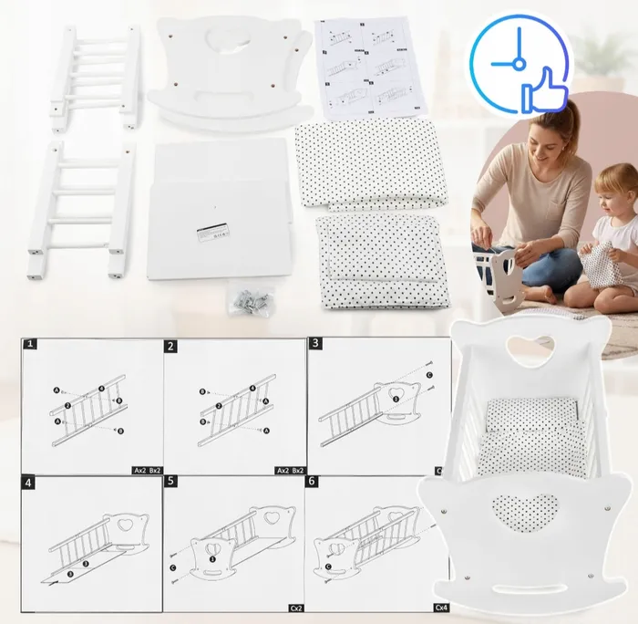 Колыбель предназначена для самостоятельной сборки, что интуитивно понятно и не вызывает никаких проблем. В комплект входит понятная инструкция, а весь процесс сборки занимает всего около 10 минут. Всего несколько мгновений — и кроватка готова к весёлым играм!