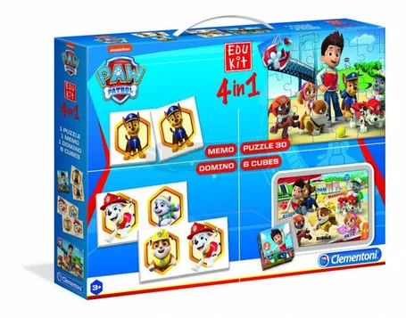 Набір Edukit 4-в-1 Щенячий патруль складається з блокнота Memo, доміно, пазла та 6 пластикових блоків, прикрашених мотивом з мультфільму «Щенячий патруль».