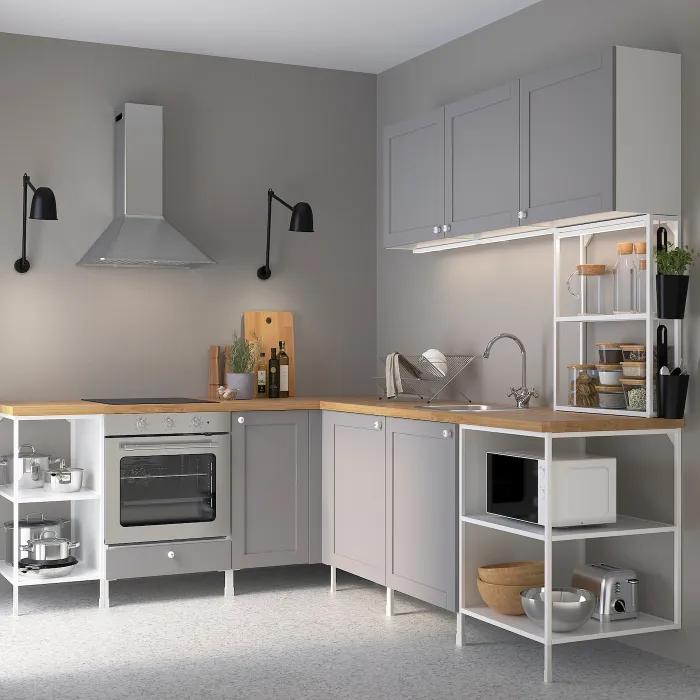 Серія ENHET дозволяє легко запровадити нове рішення на кухні. Ця комбінація пропонує простір для вбудованої фурнітури та куток для полегшення робочого процесу, оскільки все під рукою.