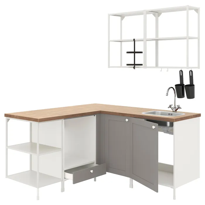 Серія ENHET дозволяє легко запровадити нове рішення на кухні. Ця комбінація пропонує поєднання відкритих і закритих місць для зберігання в кутовому плані, що полегшує робочий процес, де все під рукою.