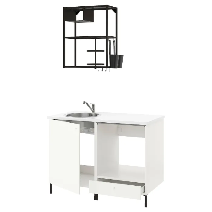 Серія ENHET дозволяє легко запровадити нове рішення на кухні. Ця комбінація пропонує поєднання відкритих і закритих речей для зберігання, стільниці та простору для вбудованої техніки - все на 130 см.