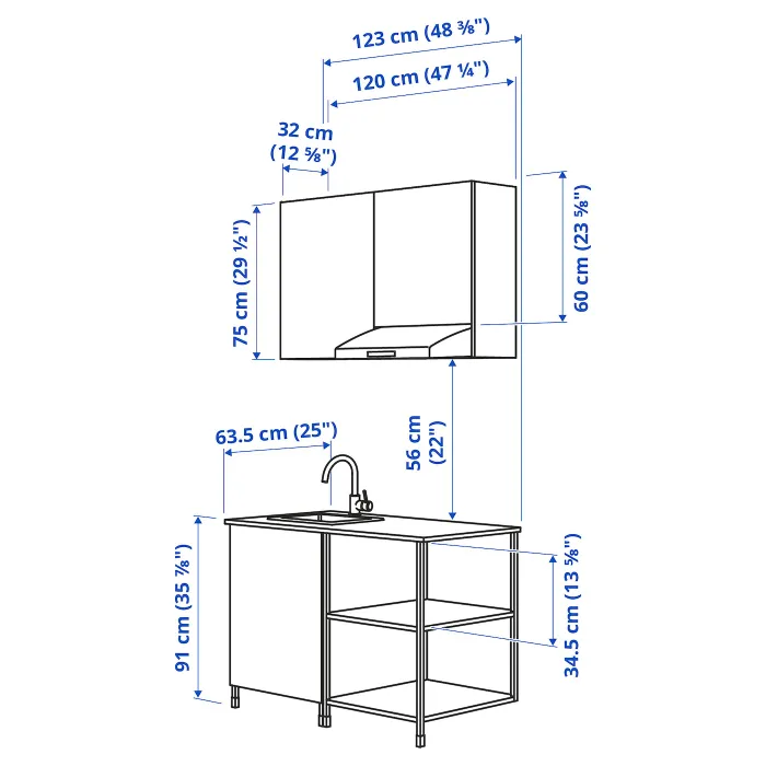 Серія ENHET дозволяє легко запровадити нове рішення на кухні. Ця комбінація пропонує ідеальне поєднання відкритого та закритого зберігання, а також спільного робочого простору та місця для приготування їжі - все на 130 см.