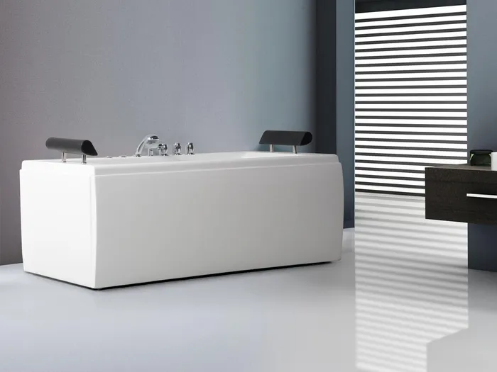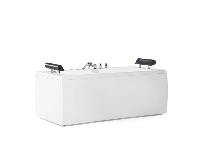 Монолітна прямокутна ванна, натхненна класичною формою. Ванна має елегантну хромовану фурнітуру та два підголівники, оббиті вишуканою чорною штучною шкірою. Він оснащений функцією гідромасажу та світлодіодним підводним підсвічуванням. Завдяки компактним розмірам ванна чудово підходить для невеликих ванних кімнат. Конструкція посилена скловолокном для довговічності.