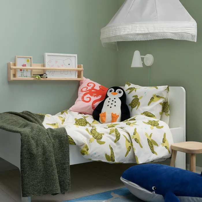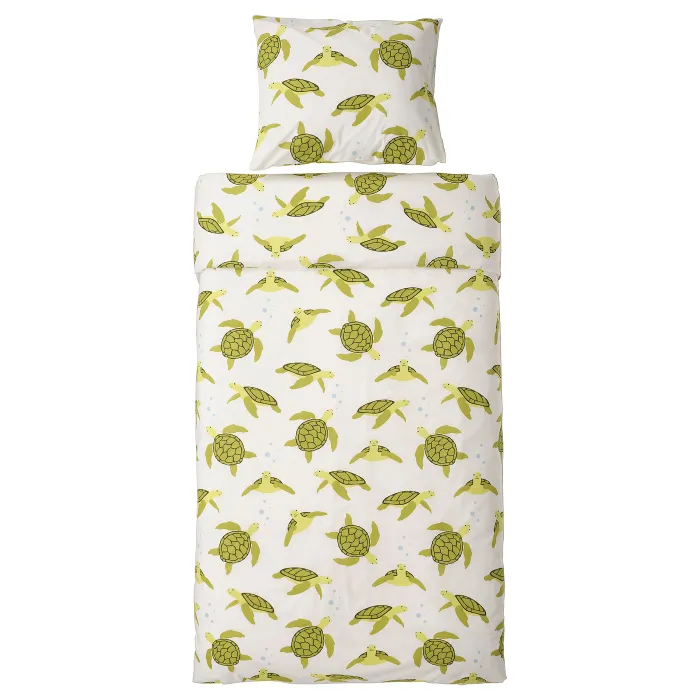 Черепаха на цій підодіяльнику та наволочці також доступний у вигляді м’якої плюшевої іграшки в колекції BLÅVINGAD.