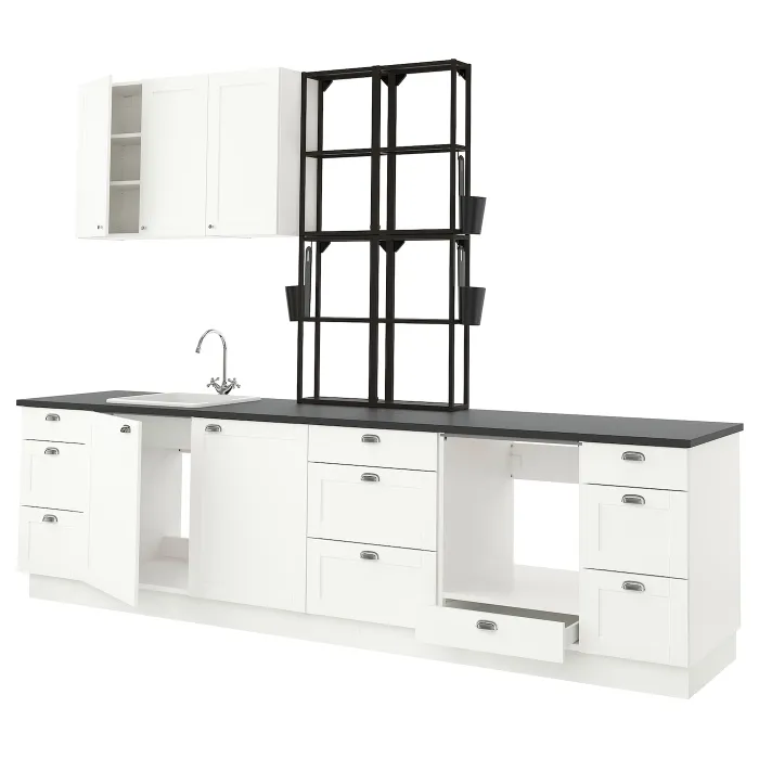 Серія ENHET дозволяє легко запровадити нове рішення для вашої кухні. Ця комбінація пропонує індивідуальне поєднання відкритих і закритих шаф, просторого робочого простору та всіх функцій, необхідних починаючому кухарю.