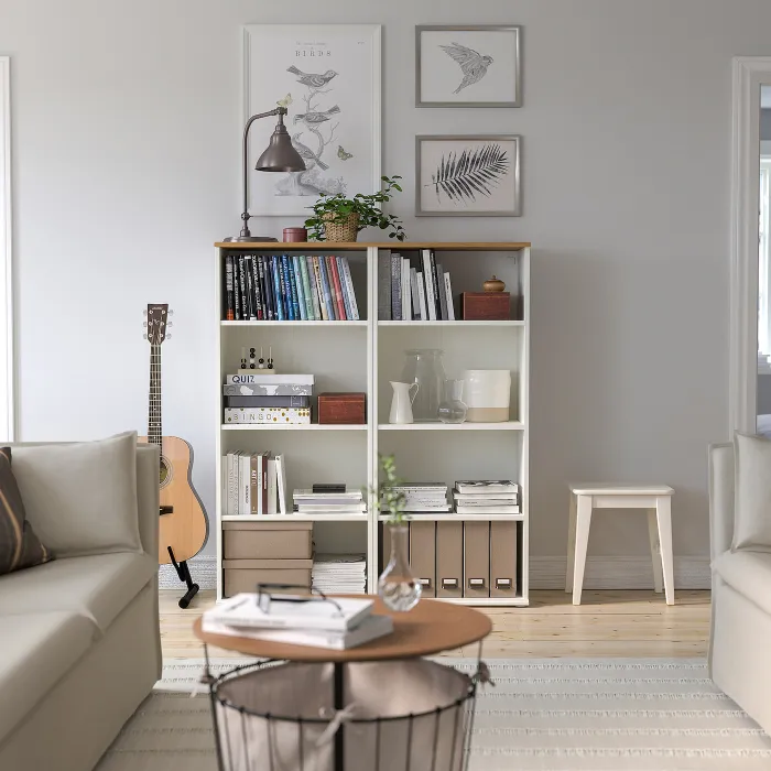 Серія SKRUVBY має традиційний вигляд з окремими блоками зберігання, які можна узгоджувати між собою. Ця книжкова полиця надає інтер’єру природного й теплого відчуття — ідеально підходить для книг та інших гарних речей.