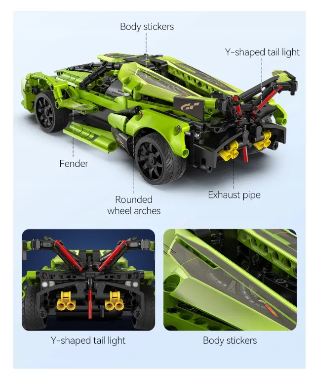 Набір складається з 432 елементів і дозволяє самостійно зібрати спортивний автомобіль Blade на дистанційному керуванні . Автомобіль створено з особливою увагою до деталей , які забезпечать неймовірне задоволення. Оснащений 4 гумовими колесами , які дозволяють пересуватися по різних поверхнях. Автомобіль має зелений кузов з чорними елементами. Дистанційне керування або додаток для дистанційного керування дозволяє керувати автомобілем вперед, назад, праворуч і ліворуч. При русі вперед вмикаються передні ліхтарі, а при русі назад - задні. Набір упакований в елегантну упаковку , що робить іграшку чудовим подарунком .
