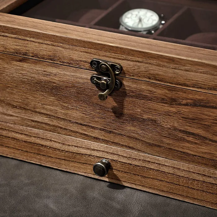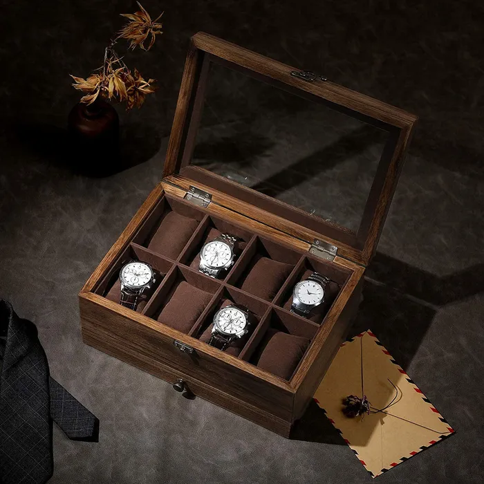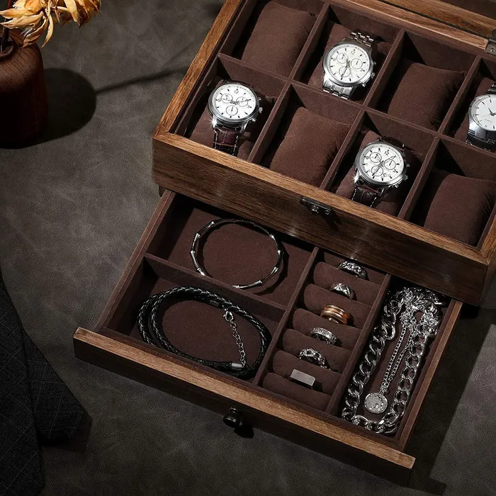 Ми представляємо вам унікальну коробку для годинника, що ідеально підходять для зберігання годинників і ювелірних виробів. Зроблено з твердої деревини, у сільському стилі, упродовж багатьох років надасть ваші скарби безпечного та зручного зберігання. У коробці 8 відсіків розміром 8x6 см, що ідеально підходять для зберігання різних типів годинників, включно з жіночими, кварцовими або цифровими годинниками. У ящику нижче є відсіки та прогалини, які розміщуватимуть ваші кільця та інші дрібниці. Однак це ще не все! Практична скляна кришка, розташована на верхній частині коробки, дасть вам змогу легко та швидко переглядати вашу колекцію годинників. Це не тільки функціональний продукт, але й чудовий подарунок для коханої людини для особливого випадку. Красива коробка годинника також є чудовим декоративним елементом, який додасть чарівності будь-якому інтер'єру. Ви заслуговуєте на те, що ваша колекція годинників і ювелірних виробів має зі смаком удома!