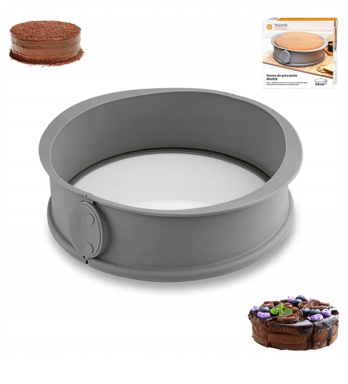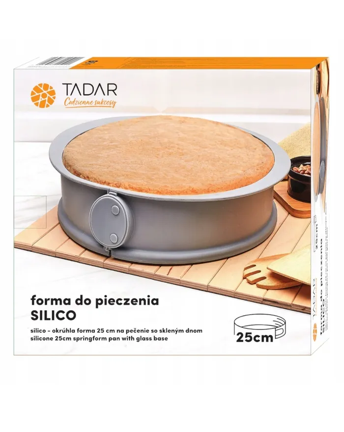 5903313445221 ОписФОРМА СИЛІКОНОВА КРУГЛА ЗІ СКЛЯНИМ ДНОМ 25см Silico GREYФорма для запікання з силіконовим бортиком і знімним скляним дном обов'язково повинна бути на кожній кухні. Завдяки цьому ви можете готувати різноманітну випічку , наприклад, торти, сирники чи бісквітні коржі, не змащуючи внутрішню частину та не користуючись папером для випічки . Силіконовий бортик із застібкою та ручками для перенесення дозволяє легко знімати готові торти, а знімне скляне дно можна використовувати як елегантну сервірувальну тарілку . Форма проста в обслуговуванні та експлуатації - вона витримує температуру до 200 градусів за Цельсієм , що дозволяє випікати різноманітні десерти, а також створювати холодні торти. Незалежно від того, чи ви пекар-початківець, чи досвідчений кондитер, форма для кексів Tadar Silico Lara точно виправдає ваші очікування. Специфікація