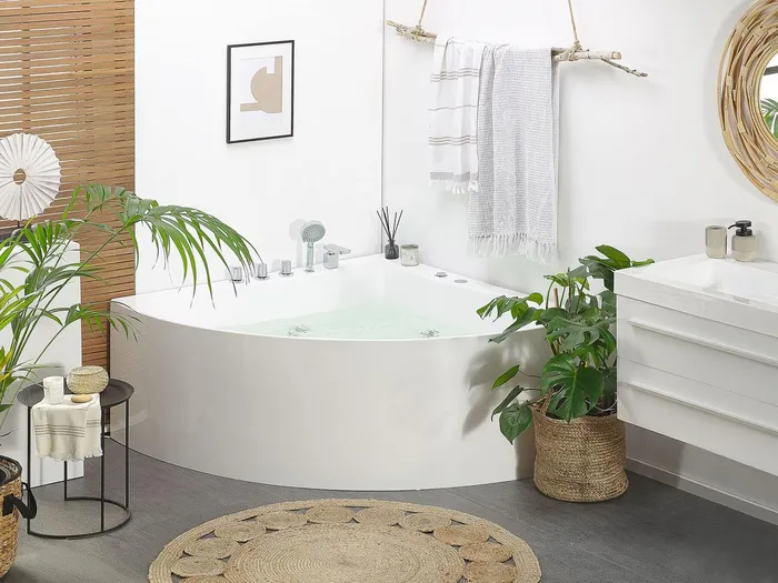 Проста кутова ванна, яка перетворить будь-яку ванну кімнату на приватний домашній спа-центр. Завдяки 4 малим і 4 великим струменям він пропонує масаж усього тіла, який знімає напругу та розслабляє як м’язи, так і розум. Оздоблений білим кольором у поєднанні зі сріблястим краном, він підходить для більшості сучасних ванних кімнат.