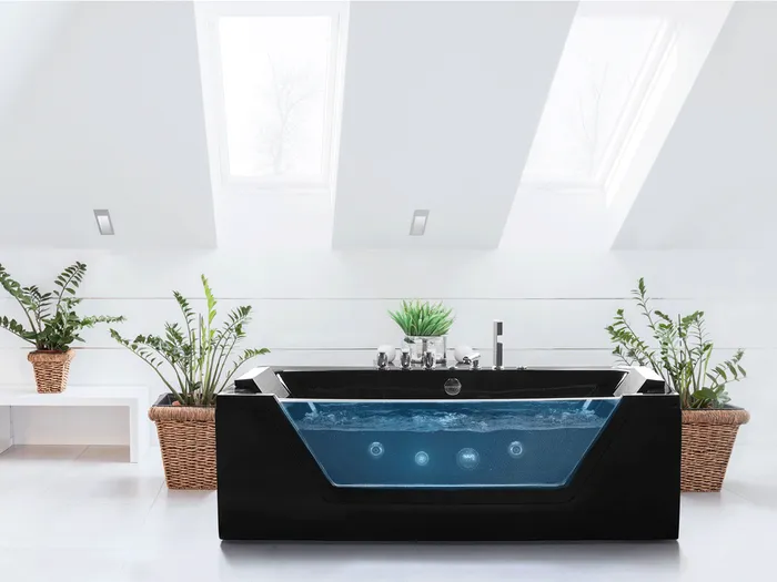 Гідромасажна ванна з підводним світлодіодним освітленням дозволить вам розслабитися після важкого дня . Ваш релакс забезпечать зручні підголовники та масажні форсунки. Одна зі стінок ванни замінена скляною склопакетом. Ванна виготовлена з акрилу для довговічності.