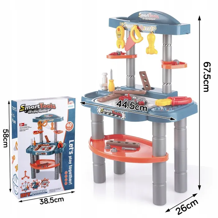 У набір для майстерні входить: пилка, гайковий ключ, плоскогубці, викрутка, молоток та інші аксесуари (шурупи, гайки, імітація дерева для згвинчування та ін.).