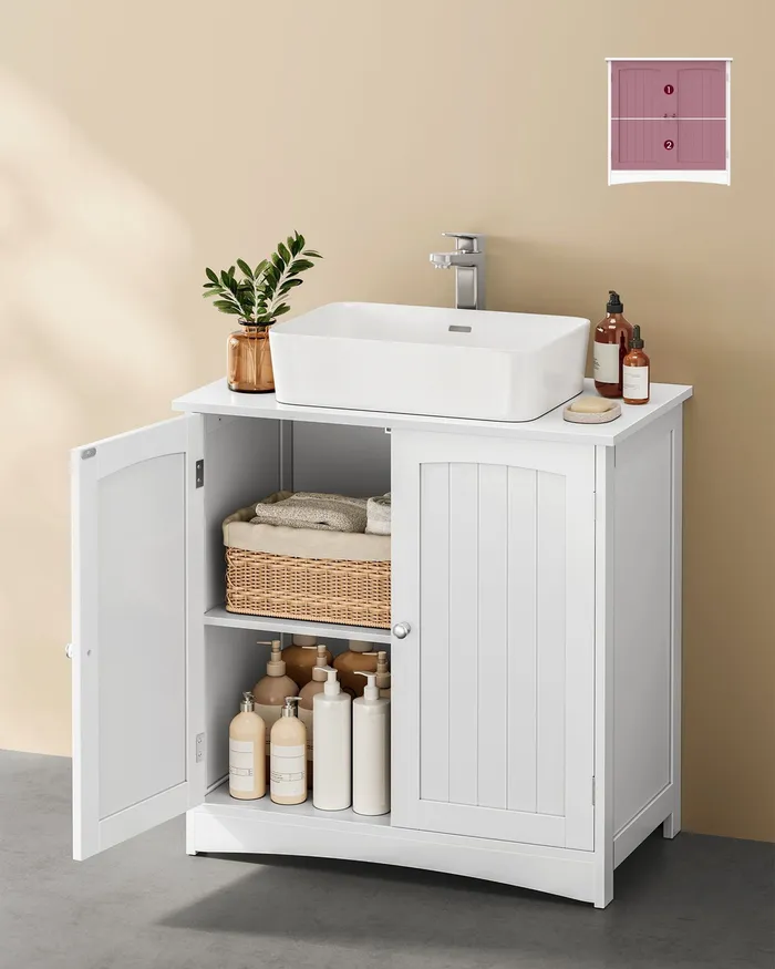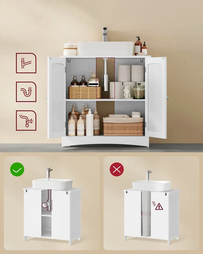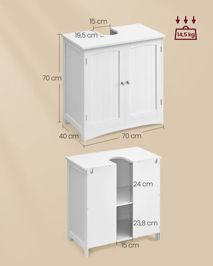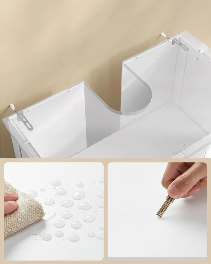 Стильна шафа для ванної кімнати під раковиною являє собою поєднання сучасного дизайну та функціональності, яке допомагає максимально використовувати простір у кожній ванній кімнаті. Виготовлений із постійних плат MDF, він забезпечує опір волозі та тривалому використанню. Просторий інтер'єр, розділений на два відсіки на трирівневу регульовану полицю, дає змогу легко зберігати об'єкти різних розмірів, як-от рушники, очисні засоби та туалетний папір. Магнітні двері гарантують зручне відчинення й закриття, захищаючи вміст від пилу та небажаного зору. Нековзні прокладки забезпечують стабільність навіть на вологих поверхнях. Шафа обладнана практичним отвором для сифона (19,5 х 15 см), який відповідає різним типам раковин, полегшуючи встановлення. Шафа — це рішення, що об'єднує естетику з практичністю, що ідеально підходить для людей, які шукають лад і гармонії у своїй ванній кімнаті.