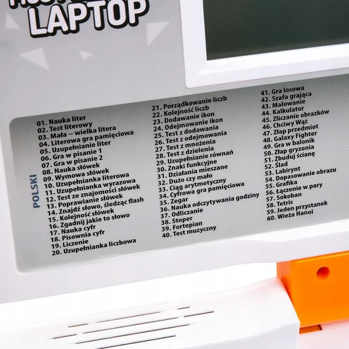 Навчальний ноутбук має загалом 120 функцій, серед яких: вибір мови (60 польських, 60 англійських), математичні завдання, музика, вправи на пам’ять, ігри та годинник.