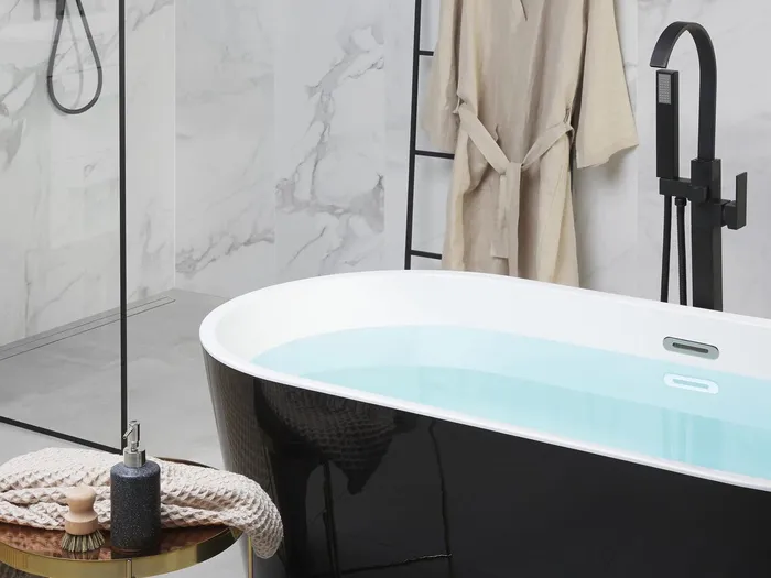 Окремо стояча ванна з чорного акрилу з глянцевим покриттям ідеальне доповнення до вашої ванної кімнати. Центральний злив дозволяє сидіти з обох боків ванни. Акрил стійкий до ударів і механічних пошкоджень, що гарантує високу довговічність виробу.