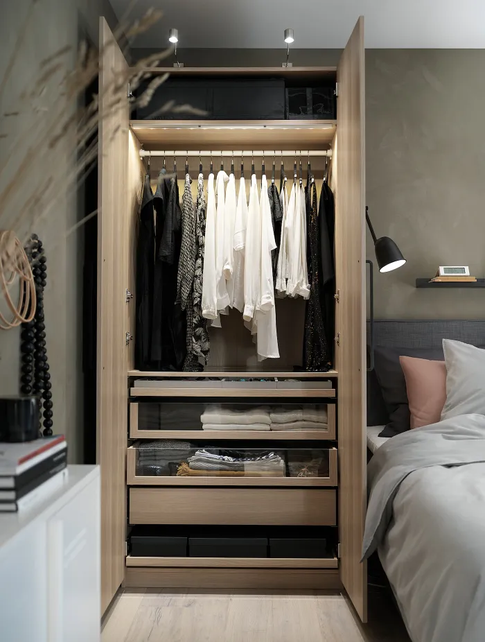 Якщо ви бажаєте укомплектувати шафу-купе ПАКС розсувними дверима, мінімальна необхідна висота стелі – 205 см.