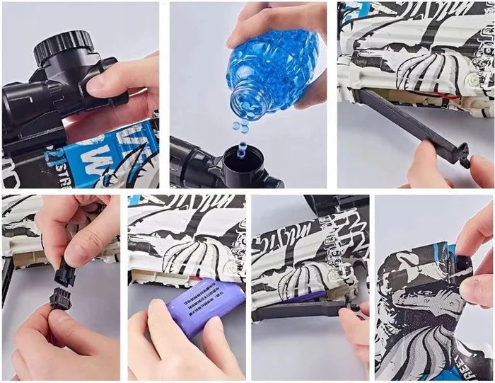 Набір містить всі необхідні елементи. Просто підключіть батарею, використовуйте кульки, і готово! В упаковці ви знайдете аж 8000 картриджів для води . Вони абсолютно безпечні, вони розбиваються об перешкоди, тому їх можна використовувати і всередині кімнати. Окуляри, що входять в комплект, додатково підвищать безпеку під час зйомки.