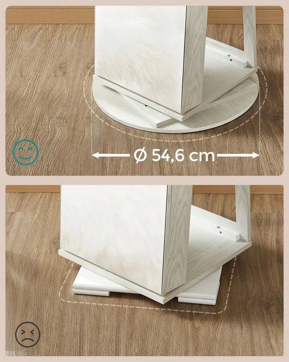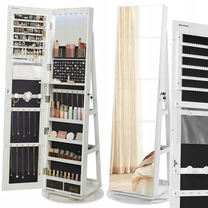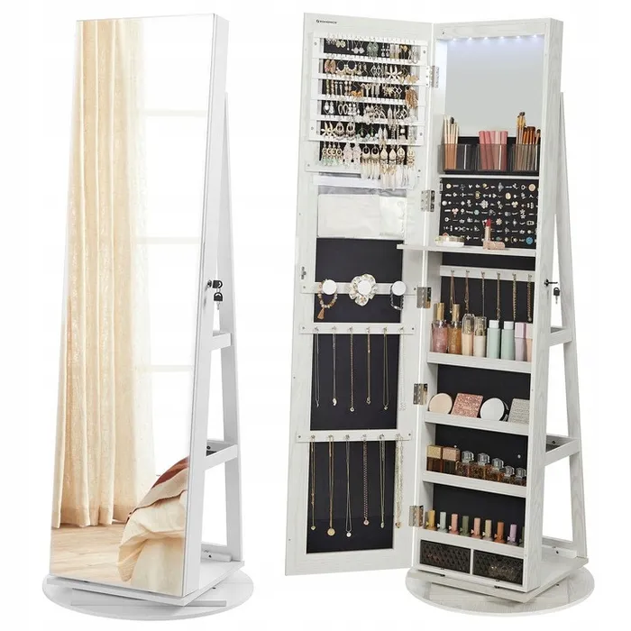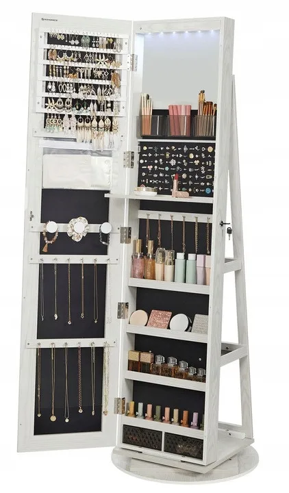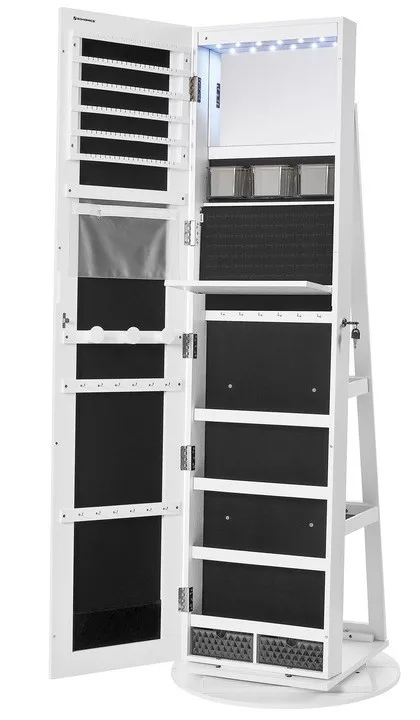 Шафа в світло-сірих тонах з деревним малюнком і безрамним дзеркалом забезпечить ексклюзивне місце для зберігання прикрас, парфумів та інших косметичних аксесуарів. Унікальною особливістю цієї шафи є функція обертання на 360°, яка забезпечує легкий доступ до внутрішньої частини, а можливість замикання забезпечує безпечне зберігання цінних речей. Інтер’єр шафи був продумано спроектований, пропонуючи достатньо місця для різноманітних ювелірних виробів, зі 120 отворами для сережок, 54 отворами для сережок, 104 отворами для каблучок, 18 гачками для намиста та 3 планками для браслетів. Крім того, 3 відділення, 2 ящики, 4 полиці і кишеня дозволяють впорядковано зберігати інші аксесуари. Дзеркало всередині шафи оснащене 6 світлодіодними лампочками, завдяки яким у будь-який момент буде легше підібрати потрібні аксесуари.