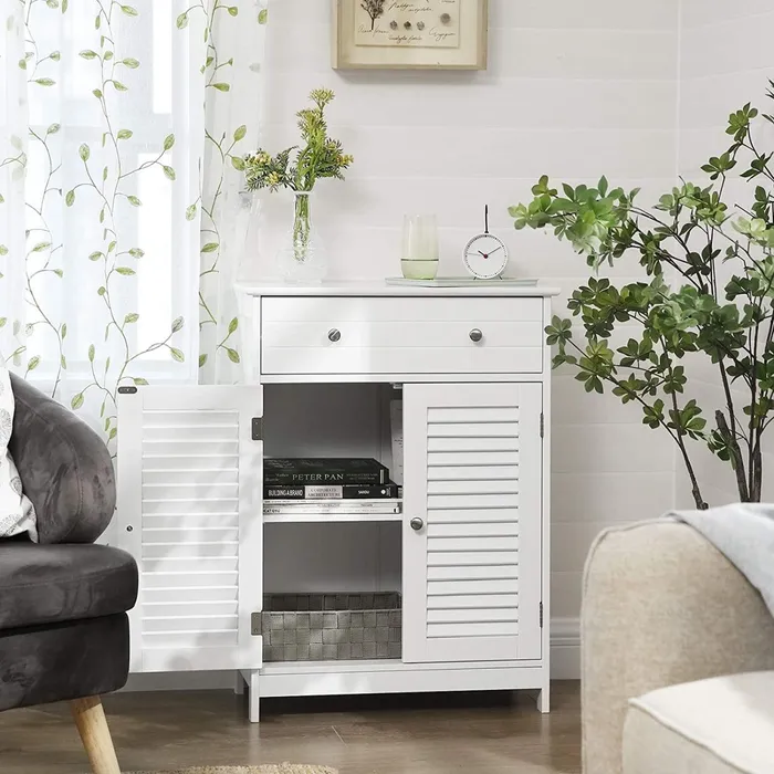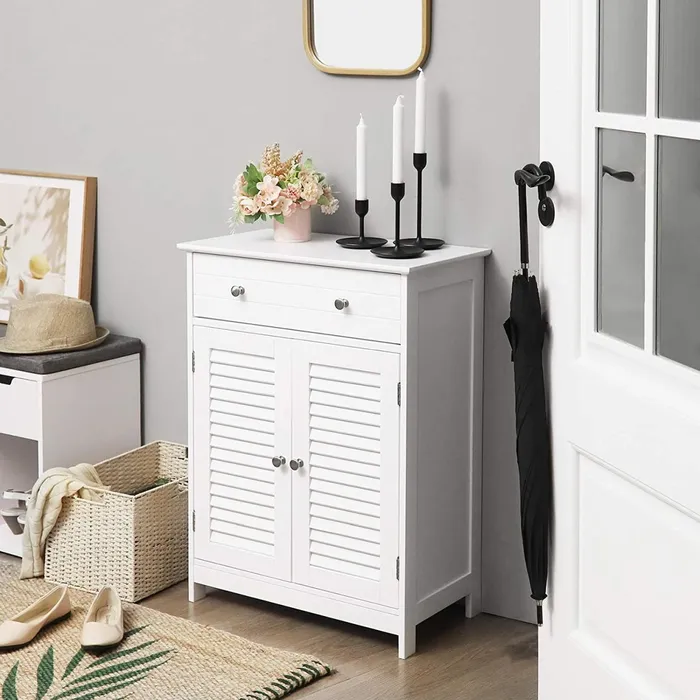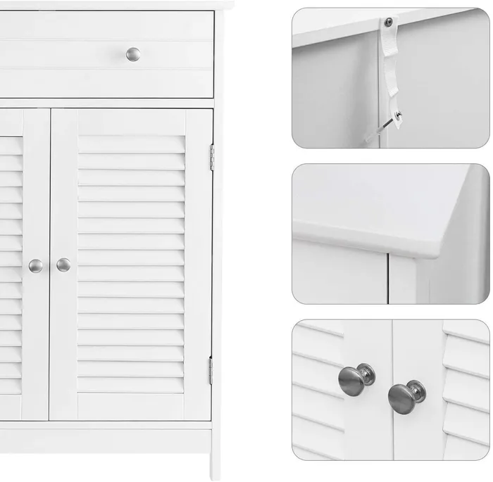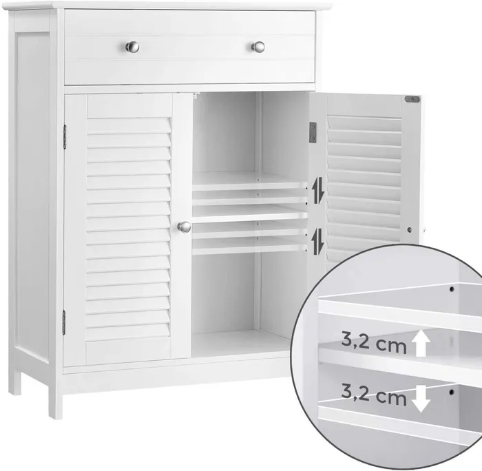 Біла, лакована шафа для ванної кімнати — чудове рішення для кожної ванної кімнати. Виготовлений із міцного MDF (клас E1), завдяки якому він стійкий до цвілі та вологи та легко чистити. Усі аксесуари для ванної кімнати й аксесуари, особливо ті, які ми не хочемо тримати на вершині, захищені від води та пилу. За декоративними дверима з металом хромовані ручки являють собою горизонтальну полицю, яку можна розміщувати на п'яти різних висотах, тому ми можемо зберігати предмети різних розмірів у шафі. Додатковий простір для зберігання та сегрегації забезпечується місткою шухлядою. Шафа не тільки введе замовлення та замовлення у вашій ванній кімнаті, але й дасть йому елегантний стиль. Колекція Vasagle була створена професійною командою розробників і відповідно до стандартів захисту довкілля. Меблі для самостійного збирання — докладні графічні інструкції приведуть користувача без жодного кроку за кроком.