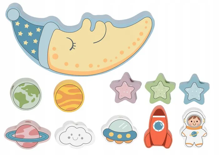 Перша частина набору є завданням на балансування: діти намагаються розмістити 10 різнокольорових блоків — ракету, космонавта, зірки, НЛО, планети та веселу хмару — на сплячому лиці Місяця, намагаючись не допустити, щоб конструкція перекидалася. Це чудова можливість попрактикуватися в точності та терпінні.