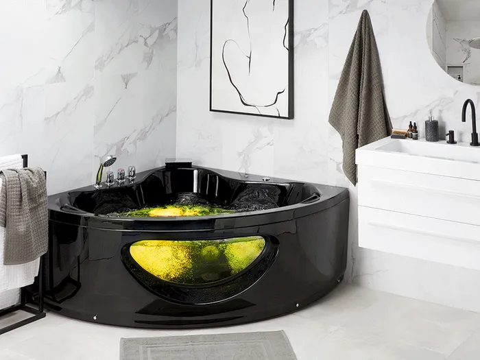 Світлодіодна кутова ванна з гідромасажем 138 х 138 см чорна TOCOA
