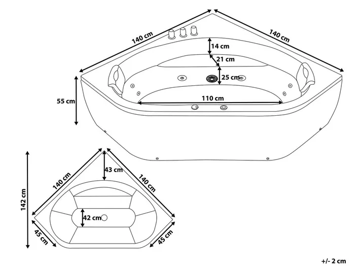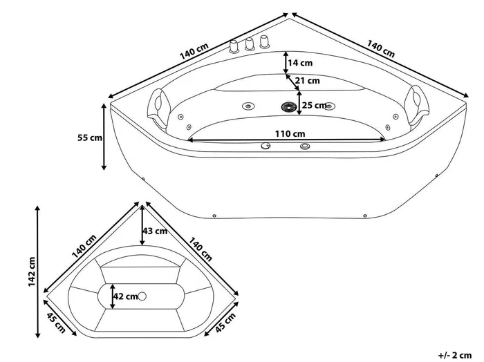 - 1 х вир, 1 х труби для гарячої та холодної води, 1 х ручний душ зі з'єднувальним шлангом, 2 х підголівник, 1 х система переливу, 1 х дренажна труба