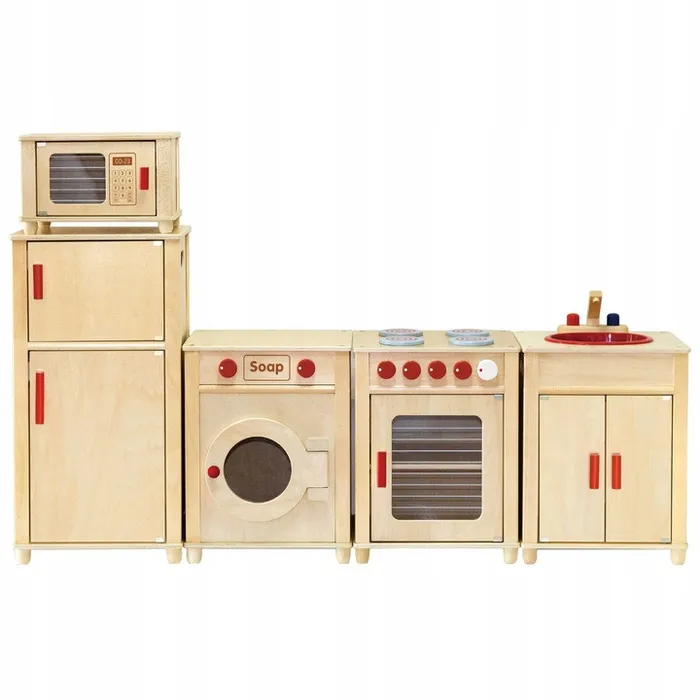 Дерев'яний дитячий кухонний набір Huge Natural від бренду Viga дозволить грати кільком дітям одночасно. Набір ідеально підходить як ігровий куточок для дітей від 3 років. Кухня складається з плити з плитою, шафи з мийкою, холодильника, мікрохвильової печі та пральної машини. Меблі виготовлені з деревини бука і березової фанери і можуть розташовуватися в будь-якому порядку . Ширина кожного сегмента 40 див, глибина 34 див. Загальна ширина гарнітура 160 див, висота від землі до стільниці 53 див, загальна висота 120 див. Комплект для самостійного складання відповідно до покрокової інструкції.