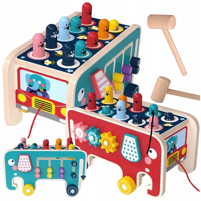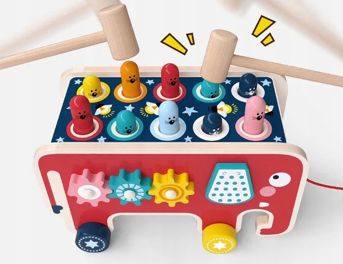- Стирчать ховрахи : у верхній частині слона, в норах є різнокольорові ховрахи. Деякі з них приховані, а інші стирчать. Постукайте по ховраху молотком із набору, і він сховається всередині. В ту ж мить з іншого отвору визирне ще один. Нескінченна розвага ;)
